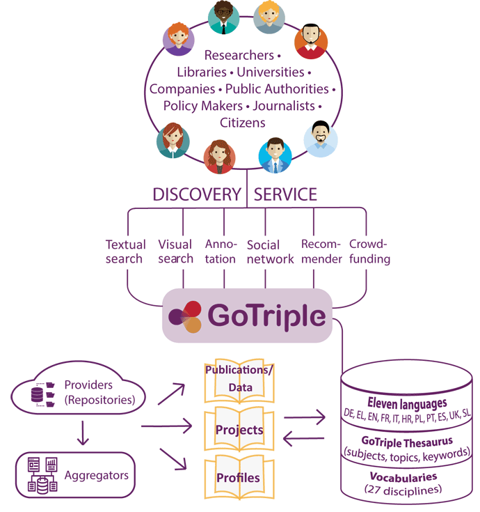 GoTriple is an innovative multilingual discovery platform for the social sciences and humanities (SSH). It provides one of the central access points for discovering and reusing research artefacts that are relevant to the wide variety of disciplines under the umbrella domain of SSH: publications and research data, project descriptions and researcher profiles are automatically imported from aggregators and source providers, semantically enriched and linked in GoTriple.