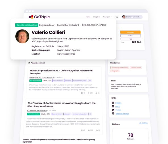 GoTriple is an Open Science discovery platform that imagines new ways to conduct, connect and discover SSH research and facilitates interdisciplinary projects and large-scale collaborations.